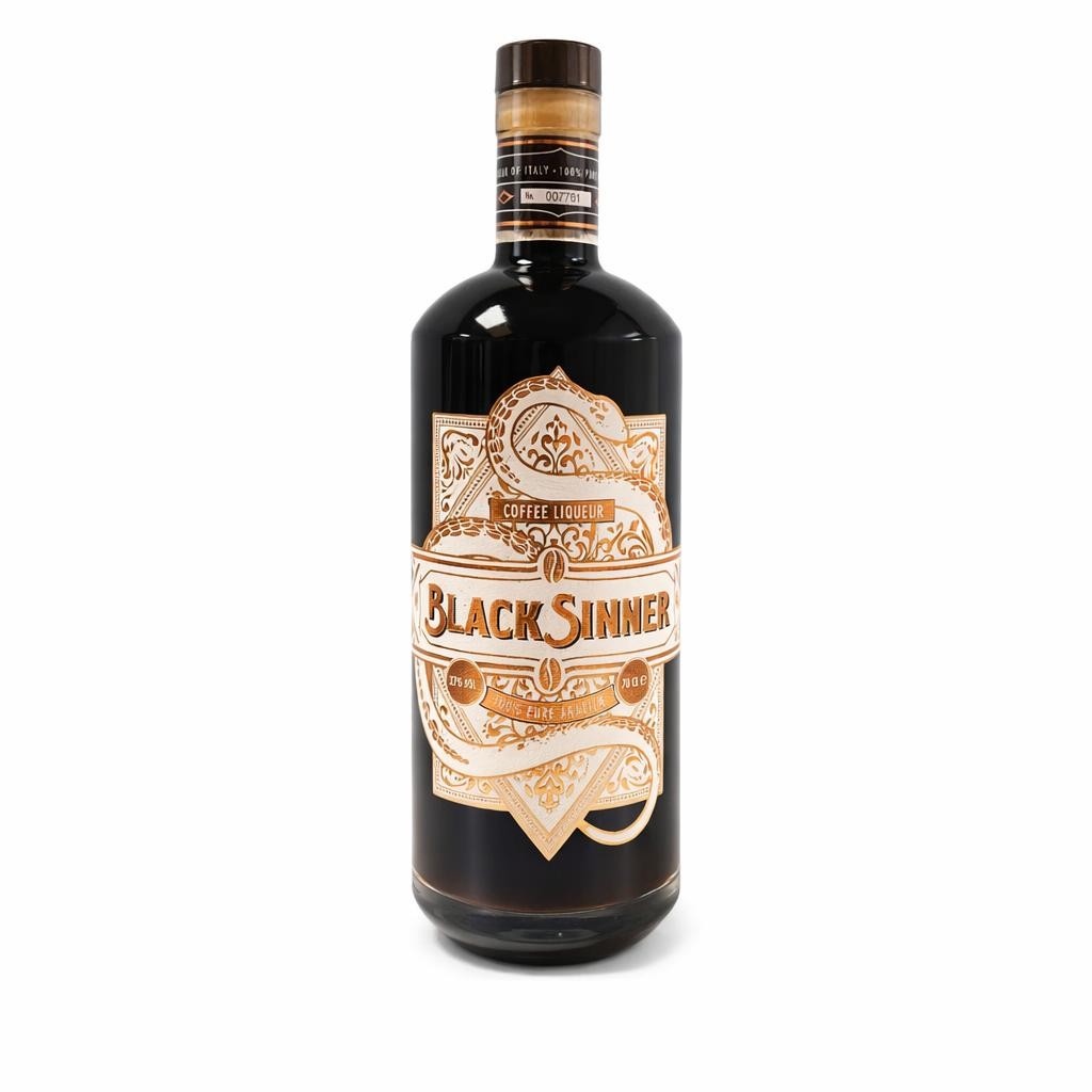 Liquore al caffè Black Sinner in bottiglia di vetro da 0,7 litri, proposto in unità singola per un’esperienza liquida intensa e avvolgente.