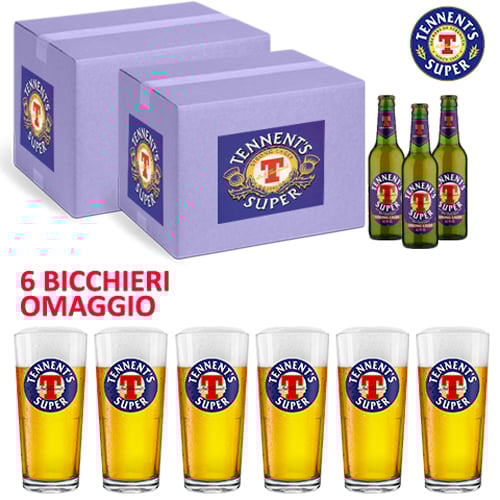 Contiene 2 confezioni di Birra Tennent’s Super cl 33 + 6 Bicchieri in OMAGGIO